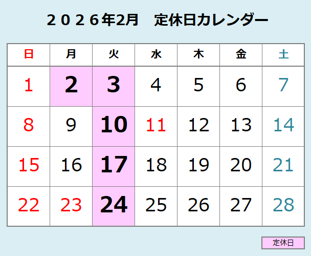 | 2026/1/29 | 【2026年2月】定休日のお知らせ |